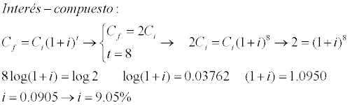*Sí el precio de las patatas se ha duplicado en 8 años, encuentra el porcentaje constante de aumento anual respecto al anterior. [Sol.:9,051%]
