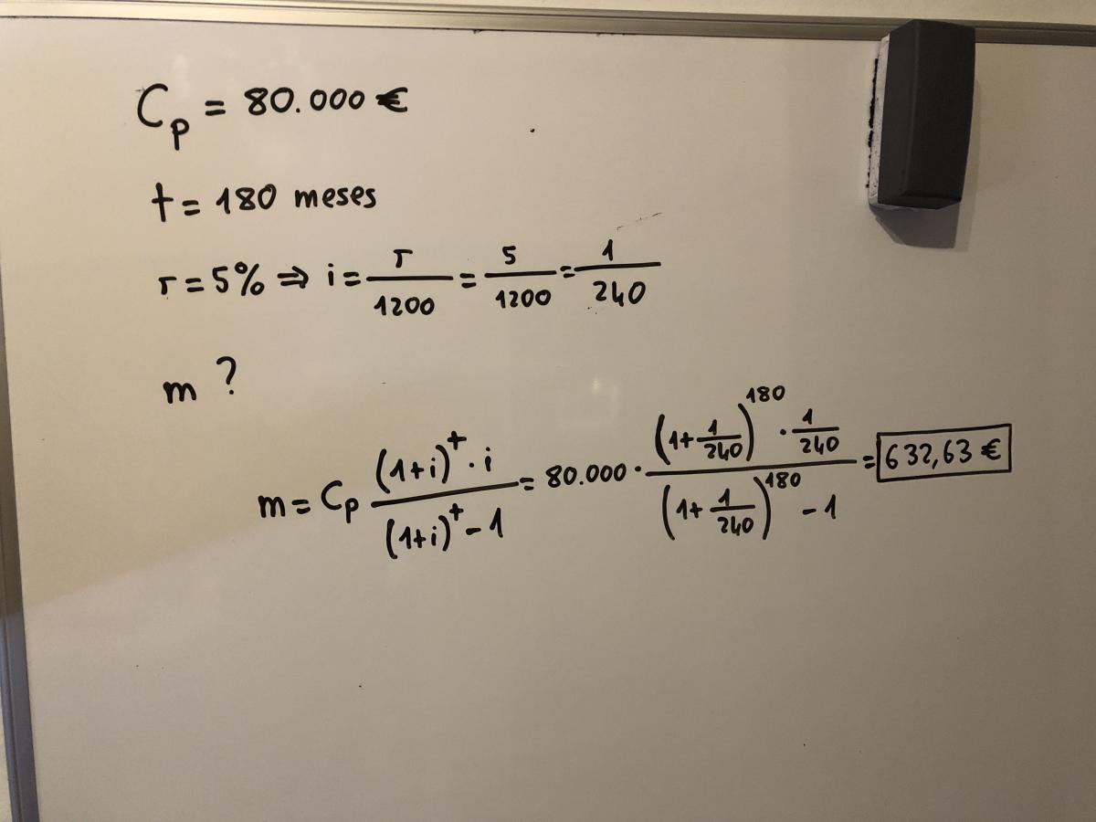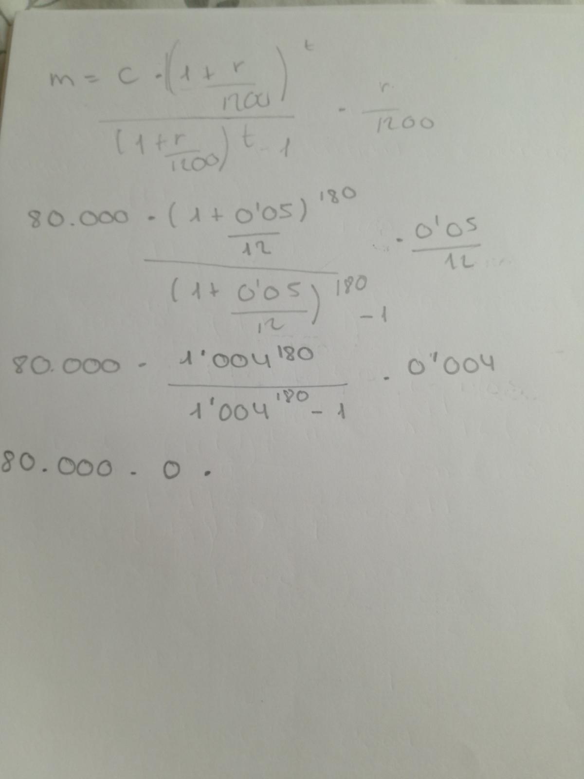 El ejeecicio pide se concede un préstamo de 80.000€. amortizado en 180 mensualidades con un interés del 5% anual. Cuál sería el valor de cada mensualidad que tendremos que pagar.