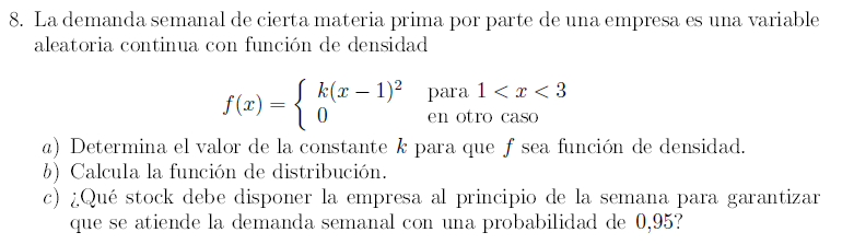 En ejercicios de variable aleatoria continua, me pide "stock que debe disponer la empresa al principio de la semana para garantizar que se atienda la demanda semanal con una probabilidad del 0,95" ¿Que debería hacer en este tipo de ejercicio?. Gracias
