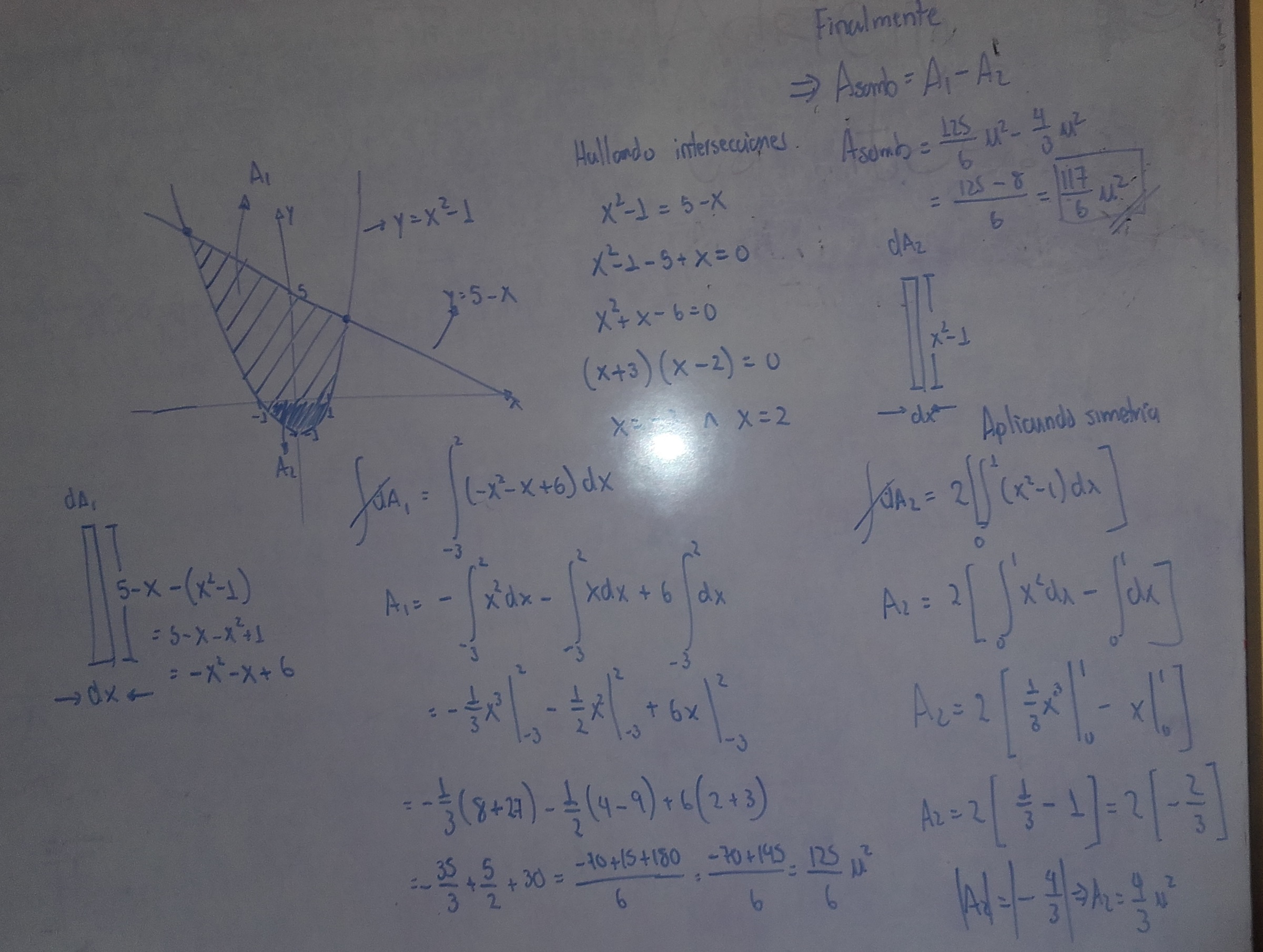 Hoola! ¿Cómo hallarían el área sombreada en rojo entre las dos funciones funciones? Las funciones son f(x)= x^2 -1 y g(x)= 5-x Gracias!