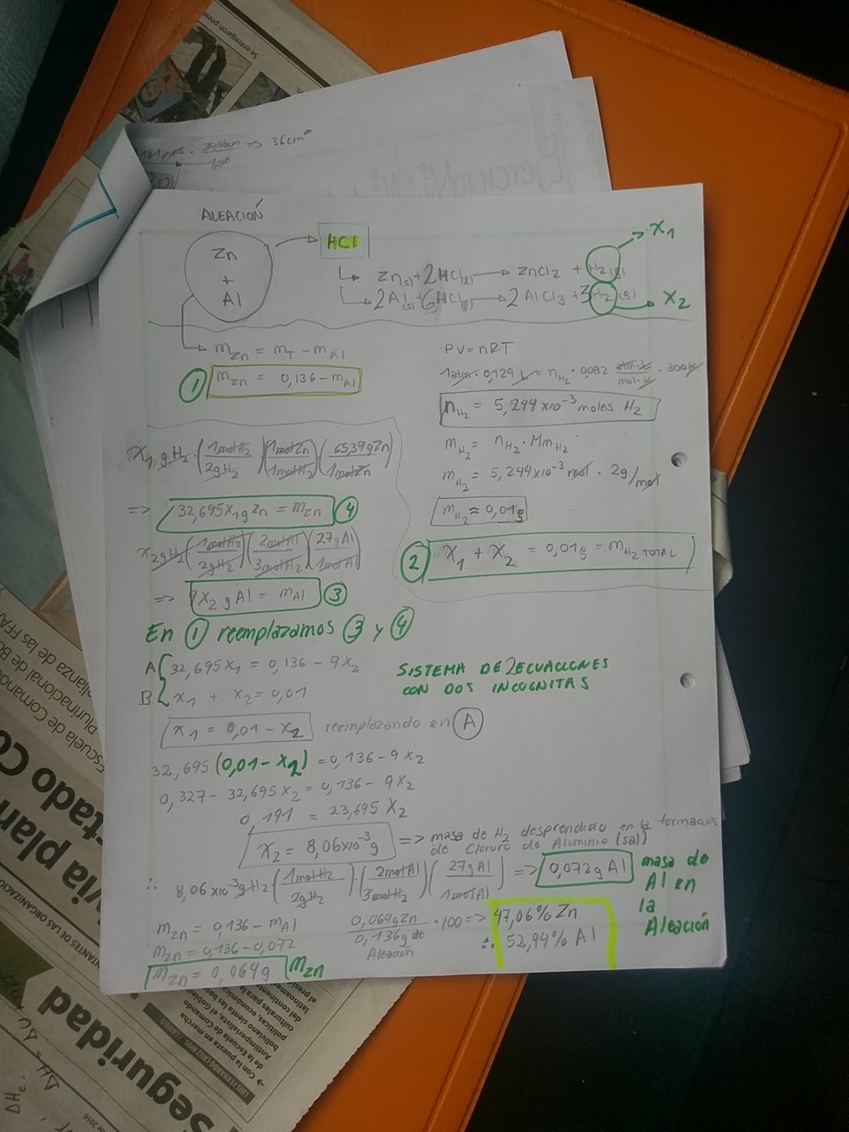 Hola Ana te dejo todo en la imagen......resuelto...lo que te pedían es la riqueza de Al y Zn que tenia la aleación antes de tratarse o reaccionar con HCl y después plantearse las ecuaciones químicas de reacción para formar las sales AlCl3 y ZnCl2 respectivamente en ambos casos desprendiendo gas hidrógeno .que calculamos con PV=nRT para hallar su masa y después plantearte ecuaciones.....espero lo hayas entendido cualquier duda responde....... Saludos.. ¯\_(ツ)_/¯