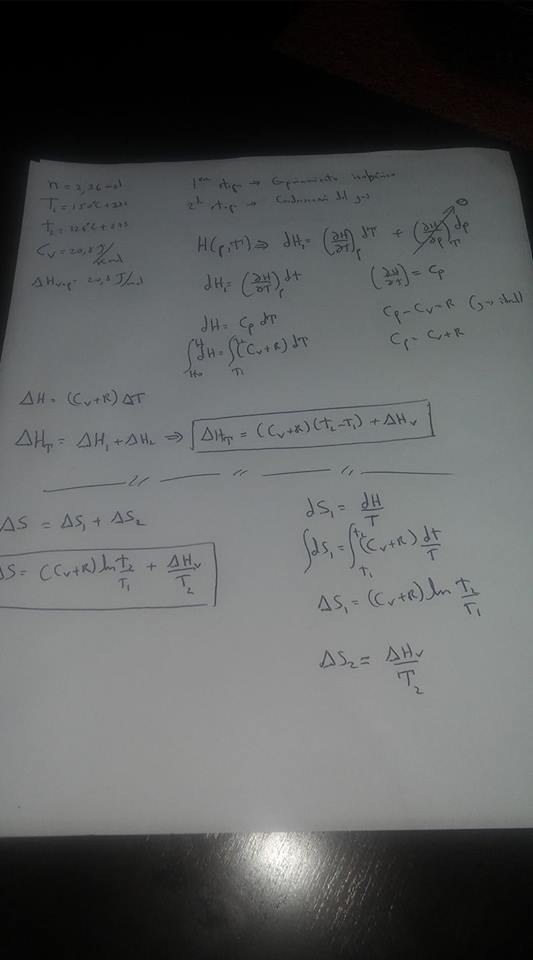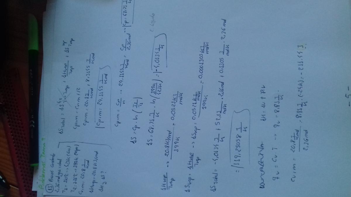 En un recipiente a presión constante se disponen 2.36 mol de un gas ideal, que se encuentran a 150 °C. Este gas se enfría hasta 126 °C, que es su temperatura de condensación. Seguidamente, se sigue retirando calor para producir la condensación de la totalidad del gas. Determine el cambio de entalpía y de entropía de todo el proceso. Datos: Capacidad calorífica molar del gas ideal a volumen constante, CV,m = 20.8 J K-1 mol-1; entalpía molar de vaporización de la sustancia: ΔHvap= 20.8 kJ mol-1.