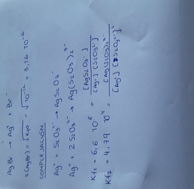 En un problema de solubilidad me preguntan: Calcular la solubilidad del AgBr (Kps(AgBr)=10-12) en presencia de S2O32- 0,1 M. Datos: Kf1(Ag+/S2O32-) = 6,6×108; Kf2 = 4,79×104. Alguien podría ayudarme por favor, muchas gracias.