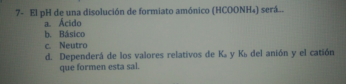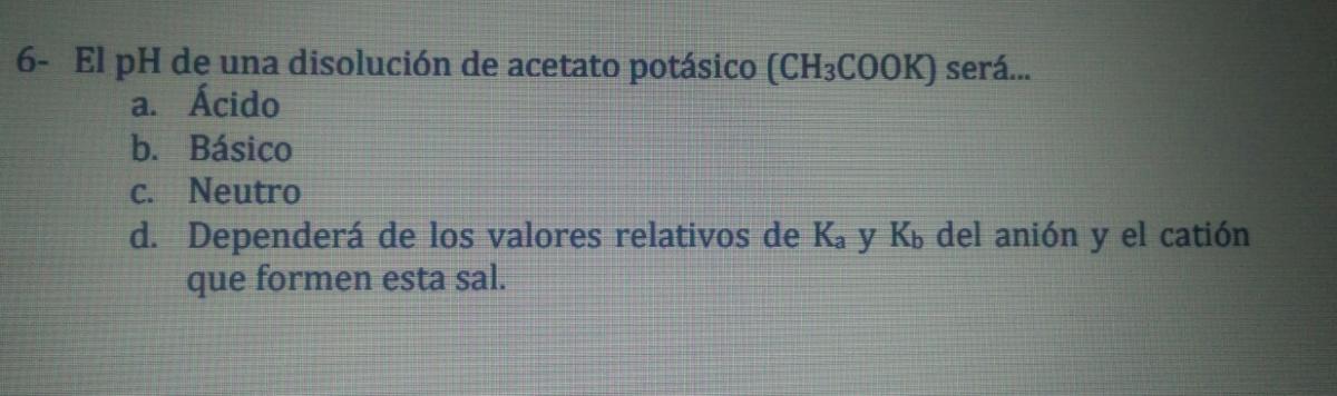El pH del acetato potásico es básico porque procede del ácido acético (ácido débil) y KOH (base fuerte).
