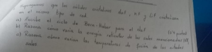 NaF, KF, LiF. Los tres compuestos iónicos tienen las mismas cargas (+1 y -1) y tienen en común el F-, por lo que la diferencia en su E reticular la determinará el catión. El más pequeño LiF será el de mayor Ereticular, después NaF y el de menor E reticular el KF.