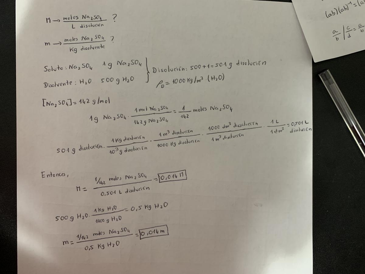 1g x 1mol/142g x 1/0,5Kg de agua =0,0141 m