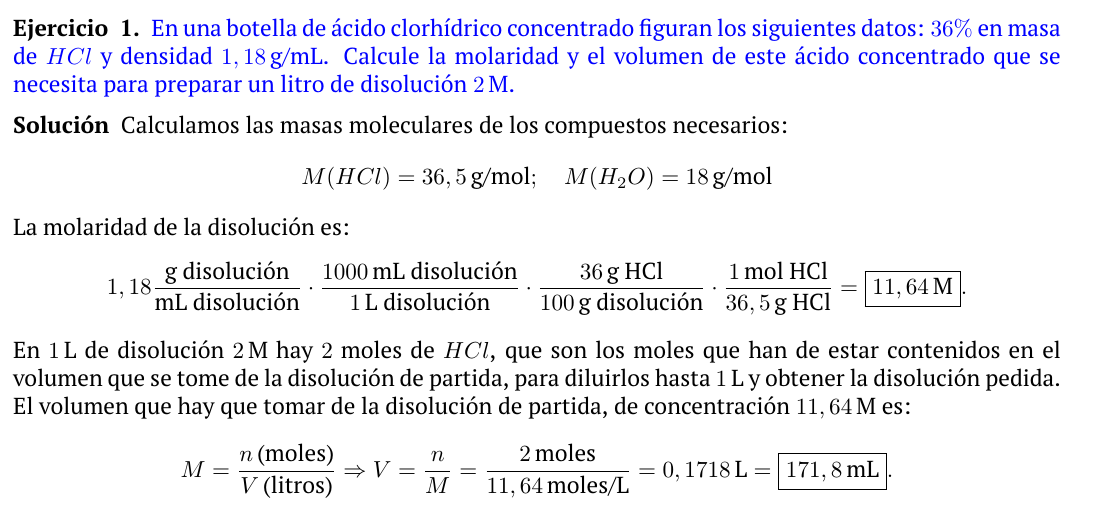 En una botella de ácido clorhídrico concentrado figuran los seguintes datos: 36% en masa de HCl y densidad 1,18 g/mL. Calcule: 5.1. La molaridad y el volume deste ácido concentrado que se necesita para preparar un litro de disolución 2 M.