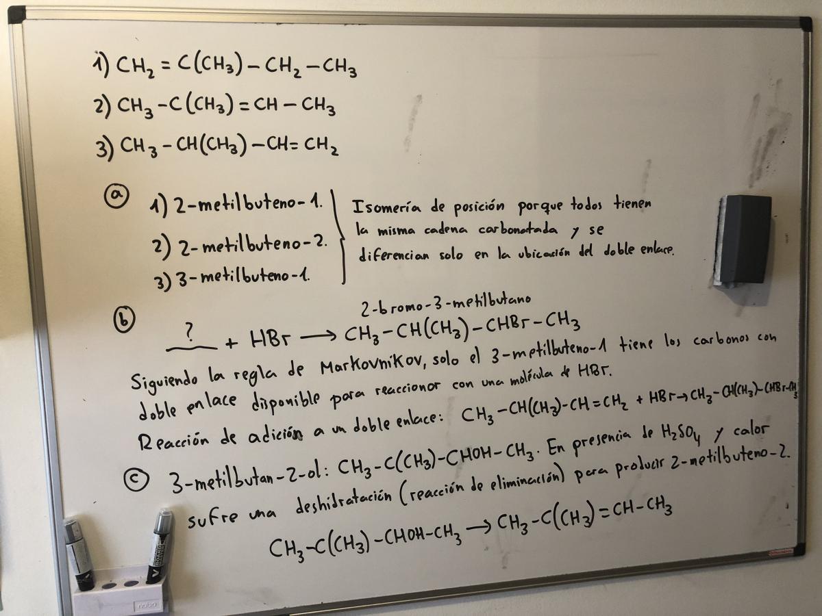 Me confundo mucho con el producto Mayoritario y minoritario. No se muy bien donde colocar el halógeno y el Hidrógeno en este tipo de reacciones. Me habían dicho (una profesora) que el H lo colocara en el C con menos Hidrógeno, pero de ser así el compuesto no estaría bien ya que pienso que el correcto será el tercero de los casos (con respecto al apartado b) por la posición del metil y quedaría como "1-bromo-3-metilbutano" según lo que me han dicho, no?. ¿Se habrá confundido o me estoy confundiendo yo en algo?.