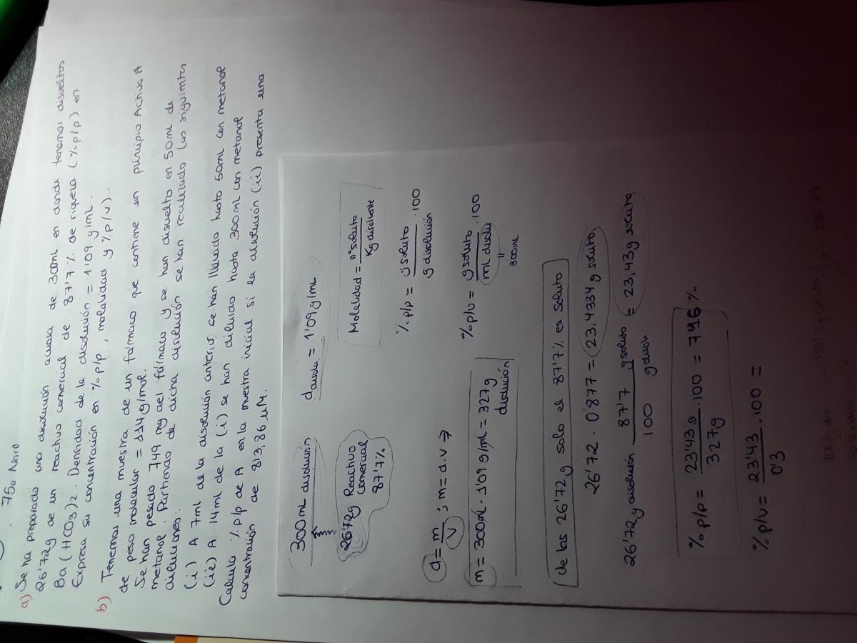 se ha preparado una disolucion de 300 ml en donde tenemos disueltos 26.72g de un reactivo comercial de 87'7% de riqueza en Ba(HCO3) densidad =1,09g/ml expresa su concentración en % en p/p modalidad % en p/v
