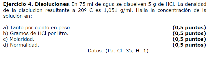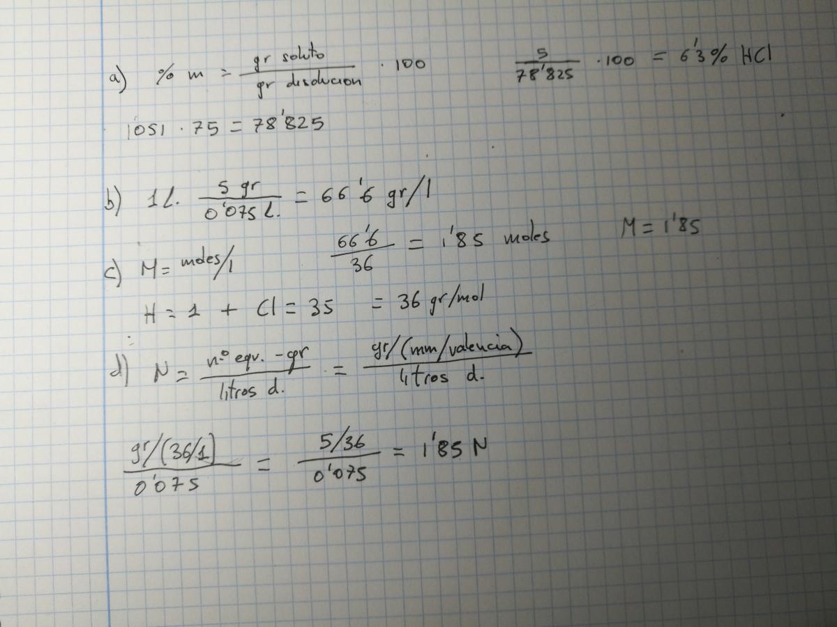en el apartado a) sería 5/80, porque partes de 75mL = 75g de agua + 5g de HCl