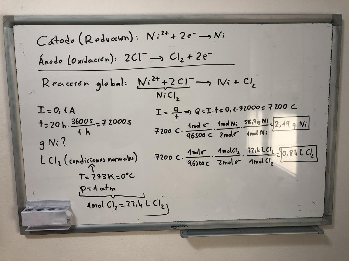 Enunciado: Calcula la masa de níquel depositada sobre el cátodo y el volumen de cloro (medio en condiciones normales) que se desprende en el ánodo en una electrólisis de NiCl2 cuando pasa una corriente de 0.1 A durante 20h.