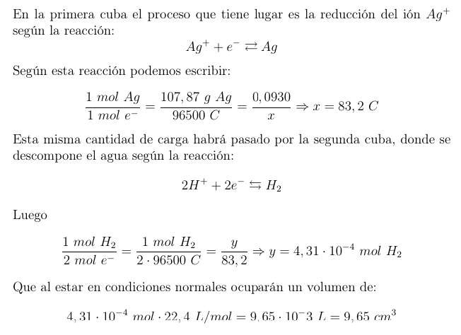 Tenemos dos cubas electrolíticas que contienen disoluciones acuosas de AgNO3 y de H2SO4, respectivamente. Al pasar una corriente eléctrica simultáneamente por ambas, en la primera se depositan 0,093 g de plata, ¿qué volumen de H2, medido en condiciones normales, se desprende en la segunda?