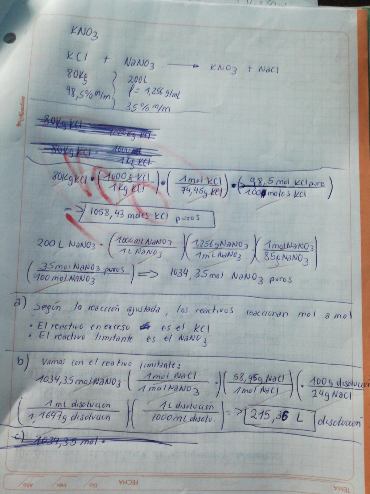 Si se agregan 80 kg de KCl sólido de 98.5% de pureza a 200L de disolución caliente de nitrato de sodio (densidad = 1.256 g / mL y 35% en masa)