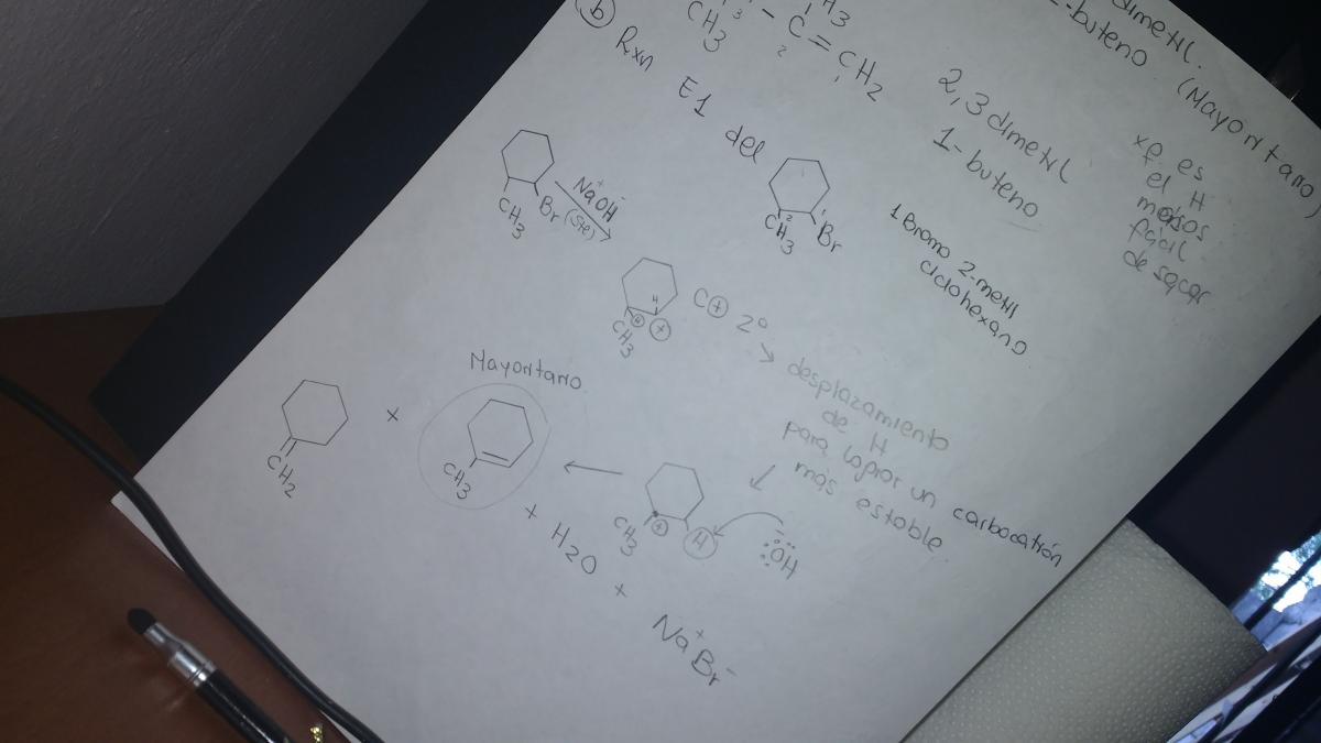 Hola unicoos! me piden la reaccion de eliminacion E1 del 1 Bromo - 2metilciclohexano.... Lo traté con una base, y luego hice una transposicion del Hidrogeno del carbono terciario hacia un carbono secundario para que me quede un carbocation terciario... los productos resultaron de eso son los que aparecen aqui debajo... esta bien planteado? la transposicion era necesaria? muchas gracias!