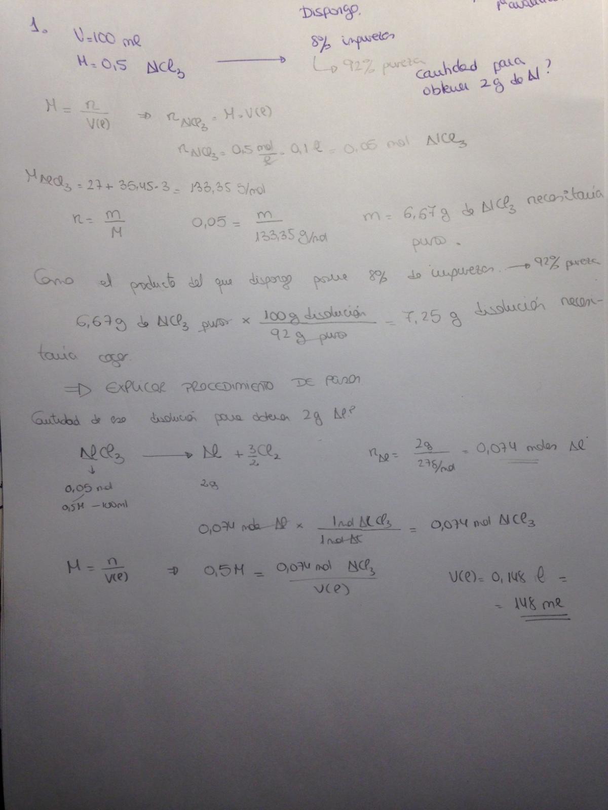 "Indica de manera detallada como prepararías ene el laboratorio 100 ml de una disolución 0,5 M en cloruro de aluminio si disponemos de un producto comercial que contiene un 8% de impurezas. Qué cantidad de esa disolución necesitas para obtener 2 gramos?"