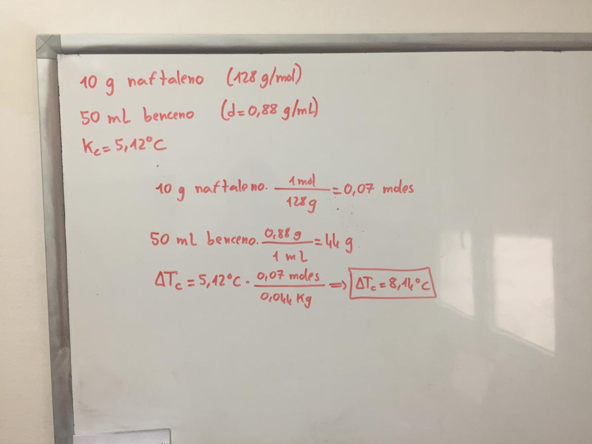se disuelven 10g de naftaleno en 50ml de benceno(densidad =0,88g/mL)¿cuál es el punto de congelación de esta solución sabiendo que la masa molar de naftaleno es 128g/mol?