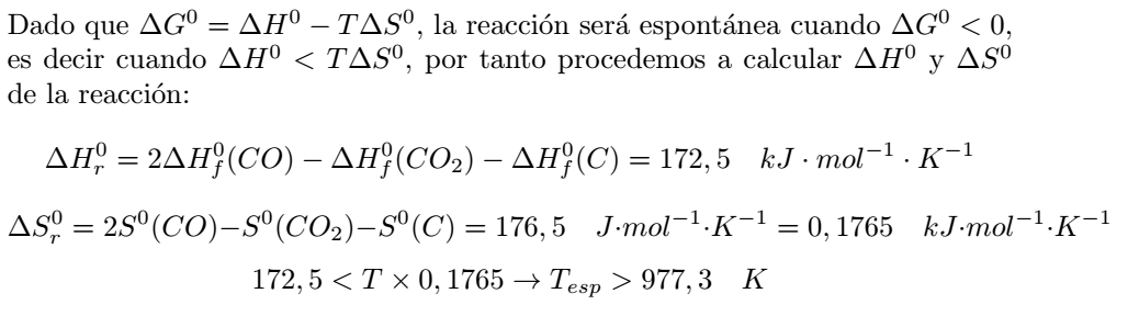 a) ¿A partir de qué temperatura es espontánea o dejará de serlo? Suponga que ΔHr0 y ΔSr0 no dependen de la temperatura.