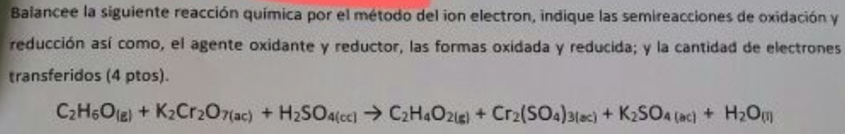Hola, disculpen me podrían ayudar en este ejercicio, sé todo el procedimiento la cuestión es que no sé con que estado de oxidación trabaja el carbono en el etanol ni en el ácido acético tampoco quién se oxida ni se reduce. Muchas gracias de ante mano. ![]()