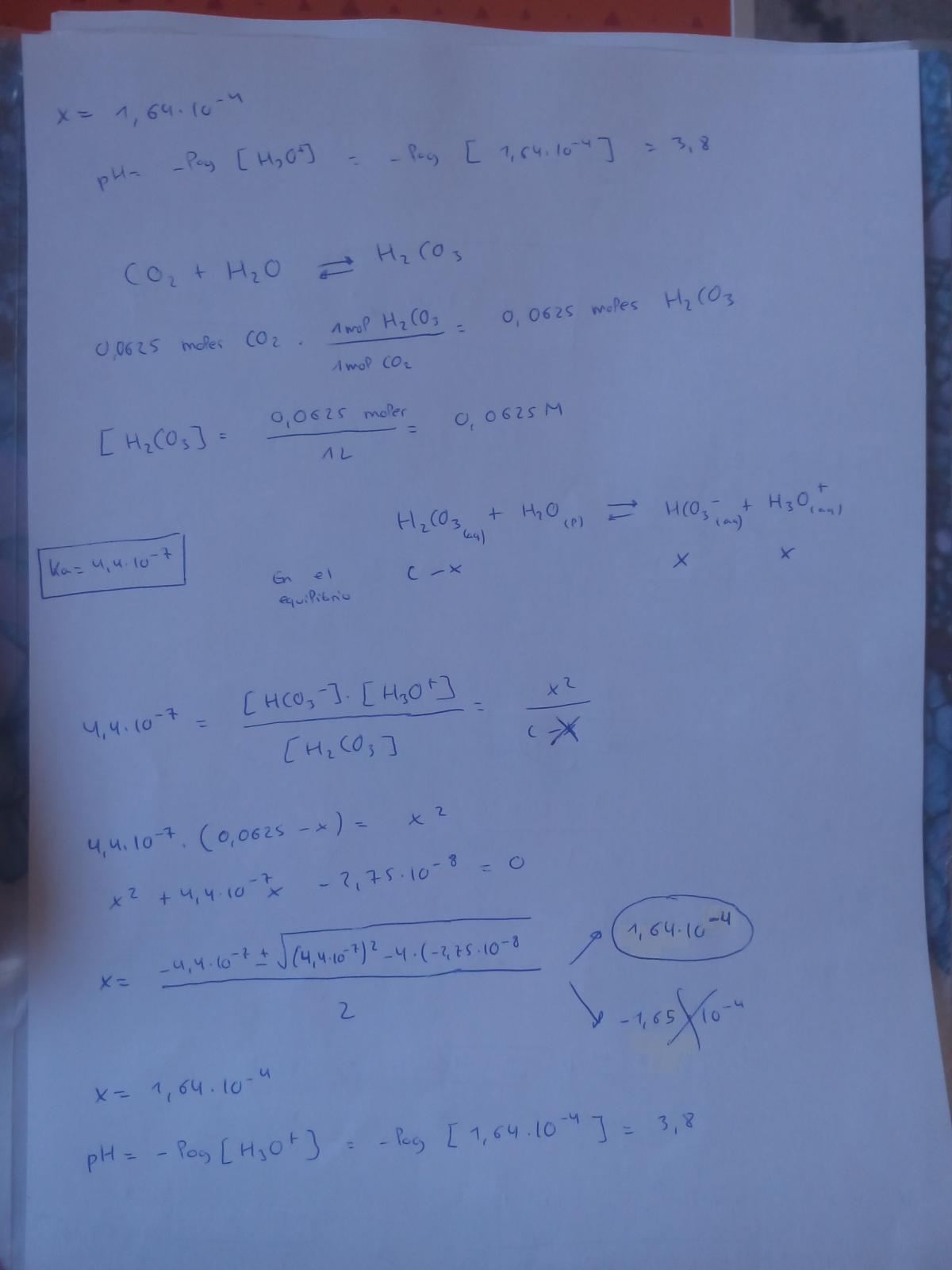 Supongamos que la milésima parte del CO2 que se produce en la reacción anterior se disuelve en el agua del mar. Teniendo en cuenta únicamente la primera ionización del ácido carbónico cuya constante de acidez es Ka = 4,4 . 10-7 , y partiendo de la reacción que has escrito en el apartado 3, calcula el pH al que daría lugar la disolución de ese CO2 en un litro de agua. (Para hacer los cálculos desprecia el volumen de H2CO3 al hallar su concentración molar, desprecia asimismo las cantidades pequeñas a la hora de resolver la ecuación de segundo grado)