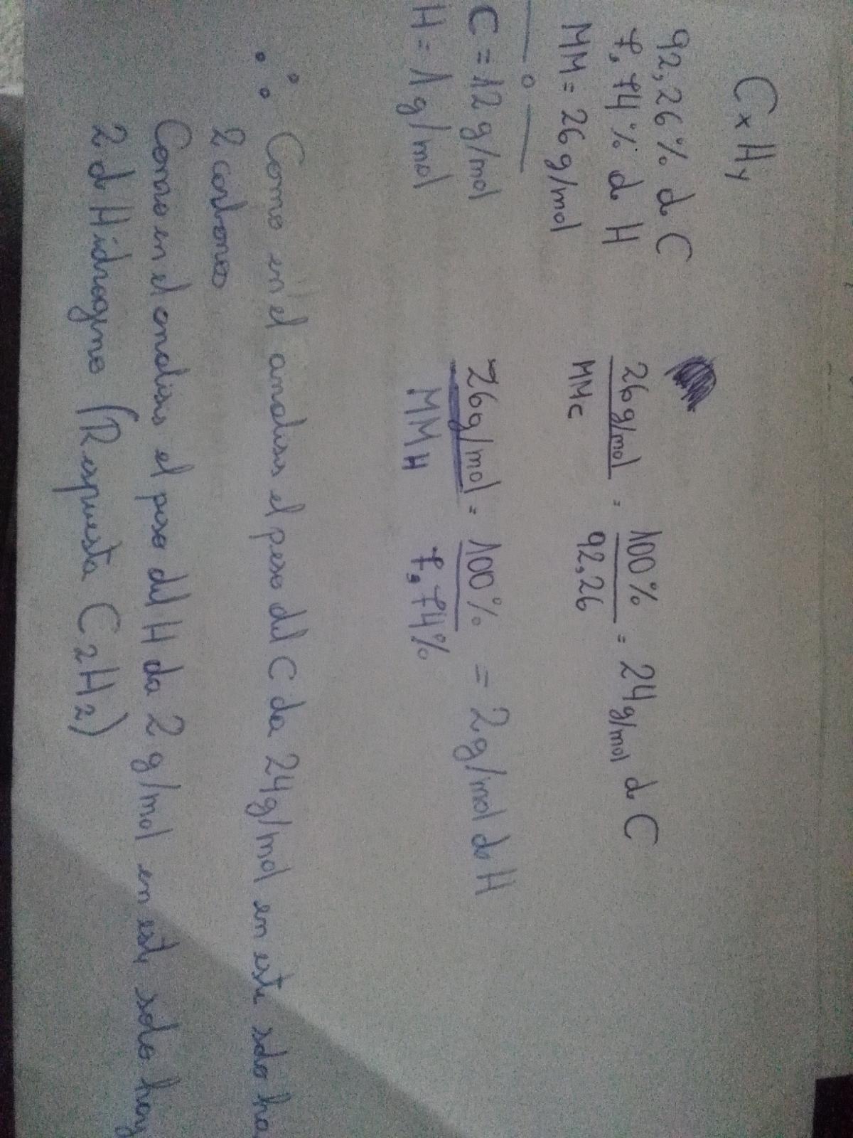 3.) el analisis de un hidrocarburo ( compuesto formado exclusivamente por carbono e hidrogeno) ha dado una composicion de un 92,26% de C.