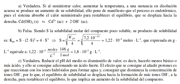 ¿Alguien sabría resolver el siguiente problema de 2º de bachillerato?: El hidróxido de cadmio (II) es una sustancia cuyo producto de solubilidad es 7,2x10^-15 a 25ºC, y aumenta con la temperatura. Justifica si son verdaderas o falsas las siguientes afirmaciones: a) El proceso de solubilización de esta sustancia es exotérmico. b) La solubilidad a 26ºC tiene un valor de 1,24x10^-5 g/L. c) Esta sustancia se disuelve más fácilmente si se reduce el pH del medio.