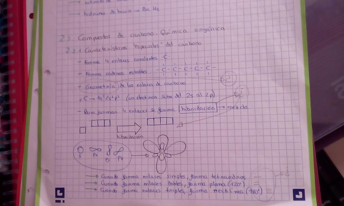 Hola buenas unicoos! Mañana tengo un exámen de química orgánica y tengo una duda. Mi profesor me la ha explicado pero no me ha quedado del todo clara para el examen y, conociéndolo, es una de las preguntas que pondrá. Por eso, quería si alguien me podría explicar la hibridación del carbono. Abajo adjunto una foto de la teoría para que os ayude a explicarme según lo que hemos dado... Es que, es una cosa que explicó al principio del tema y, para cuando lo acabamos, siempre me pasa que no lo entiendo y se me olvida lo que ha explicado... :(