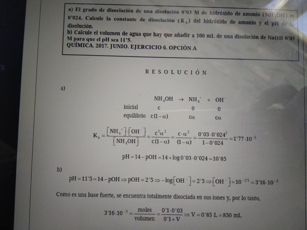 1. Partiendo de la base de que NO ES UN ACIDO/BASE FUERTE ya que tiene constante de disociación, pienso que como viene resuelta en internet no debería estar correcto, reaccionaria con agua dando amoniaco y ión hidroxilo. Por tanto la reacción que viene escrita estaría mal y la mía bien?