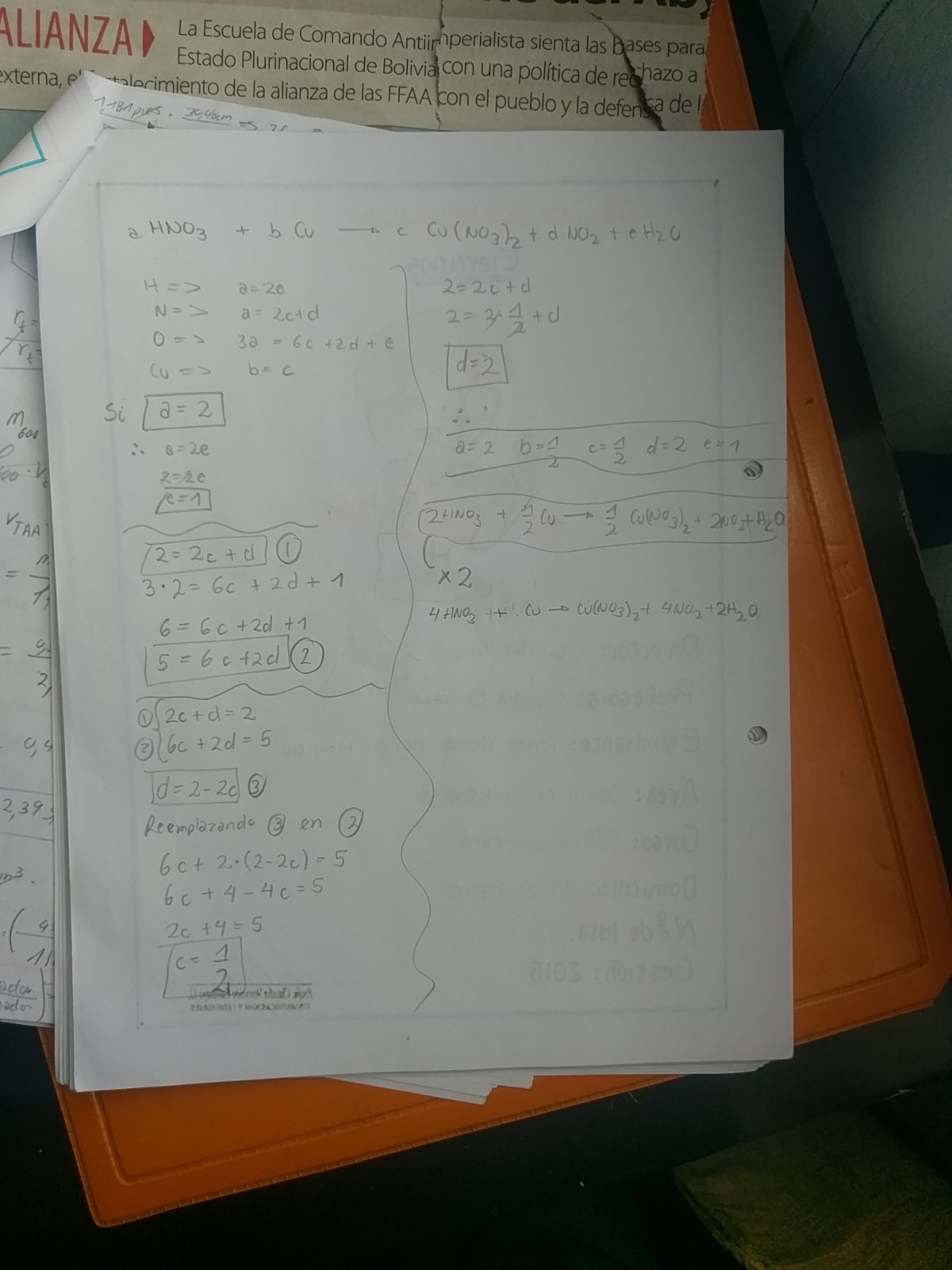 aHNO3 + bCu---->c Cu(NO3)2 + dNO2 + eH2O