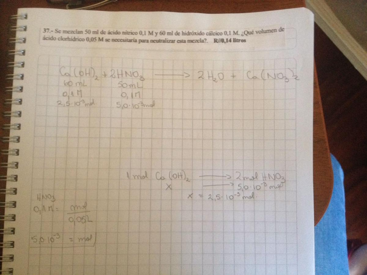 Ajustamos la nueva reacción: 2HCl+Ca(OH)2 → CaCl2+2H2O. Necesitarás por tanto el doble de moles de HCl de los que tengas de Ca(OH)2, es decir, 0.007mol HCl. Como la concentración del HCl es 0.05M, por proporcionalidad sacamos el volumende HCl necesario: