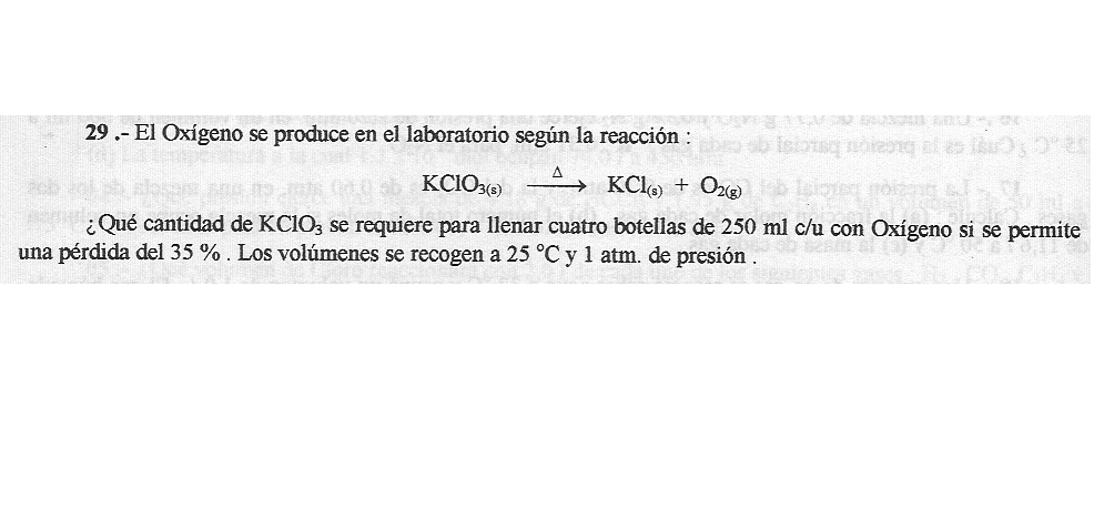 Hola Jean Piere, te explico, si en total obtienes 1L de oxígeno asumiendo un 35% de pérdida del producto (ya sea por el rendimiento de la reacción, o por el método de recogida... eso no nos concierne) deberás calcular como si hubieses recogido un 35% más de producto, o sea, 1,35 litros de O2. A partir de esta cantidad, calculas los moles a los que equivale ese volumen con las condiciones indicadas (1atm y 25ºC=298K) mediante la ecuación PV=nRT --->1 · 1,35 = n · 0,082 · 298 --> n= 0,055moles de O2. Ahora simplemente calculas cuántos moles de KClO3 se necesitaron hacer reaccionar para producir esa cantidad de oxígeno. Como podemos ver en la reacción, por cada 2 moles de KClO3 se obtienen 3 moles de O2; luego si hemos obtenido 0,055 moles de oxígeno, hemos partido de x moles de KClO3; resolvemos esa sencilla regla de tres y obtenemos x= 0,0367 moles de KClO3. Que se traduce en una masa, sabiendo que su masa molecular es 122,6g/mol, de --> 0,0367 · 122,6 = 4,5g de KClO3.