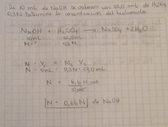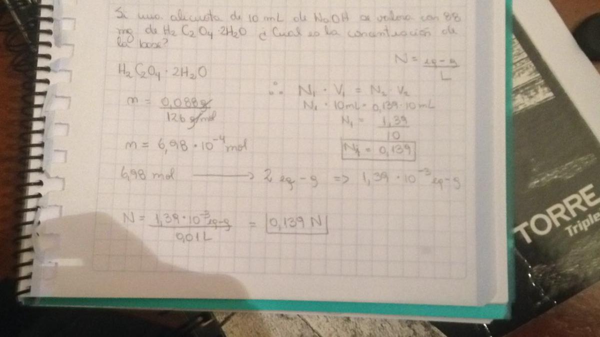 Quiero verificar este ejercicio que dice asi, ya que no se nota mucho en la foto: "si una alicuota de 10 mL de NaOH se valora con 88 mg de H2C2O4 * 2H2O. ¿Cual es la concentracion de la base? ![]()