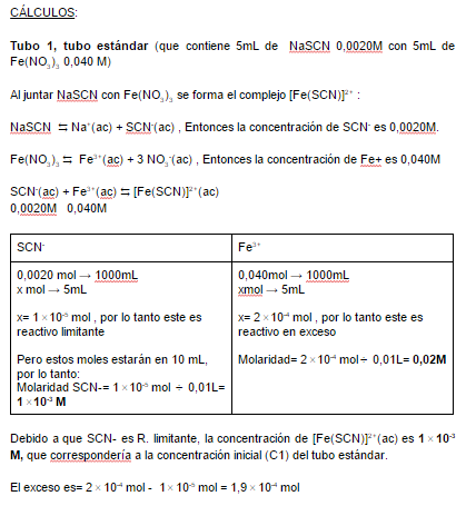Hola tengo una duda con unos cálculos de laboratorio (donde debíamos igualar concentraciones mediante la disminución de la altura de la solución, utilizando C1*h1=c1*h2 ) en donde tengo que calcular la concentración de lo que se forma al juntar 2 soluciones, una de 5mL de NaSCN 0,0020M y la otra de 5mL de Fe(NO3)3 0,040 M, (al tener esta concentración podría utilizar la fórmula después) al juntar ambos sé que se forma el complejo [Fe(SCN)]2+. Esto es lo que hice: