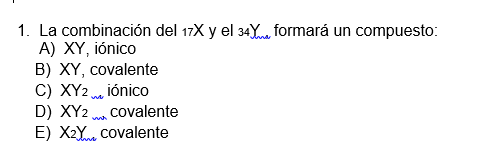 Sin ningún dato adicional, yo ahora la configuración electrónica de cada átomo (pues nos dan el número de protones/eletrones) y vería en qué grupo se encuentra cada uno. Me sale que el X está en el G.17 y período 3 (es el Cl), y el Y me sale que es el azufre. Teniendo esto en cuenta, y sabiendo que la diferencia de electronegatividad entre ambos no va a ser exagerada pues se encuentran bastante cerca, la combinación de ambos no nos va a dar un compuesto iónico. Ahora bien, sabemos que es covalente, pero es imposible que sea XY pues los 2 elementos tienen números de oxidaciones que hacen esa fórmula imposible (el Cl los tiene impares y el S pares); por lo que yo apostaría a que fuera la fórmula X2Y.