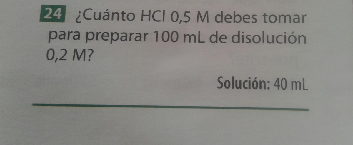 Hay otra formula si no recuerdo mal que simplifica todos los cálculos anteriores: M1 x V1 = M2 x V2 . De manera que colocamos las molaridades, el volumen dos es el de la disolución que queremos obtener (100ml = 0,1L) y el volumen uno es incógnita. 0,5 x V1 = 0,2 x 0,1 y despejando la V1 obtenemos 0,04L, o sea, los 40ml que necesitamos de la disolución de HCl inicial.