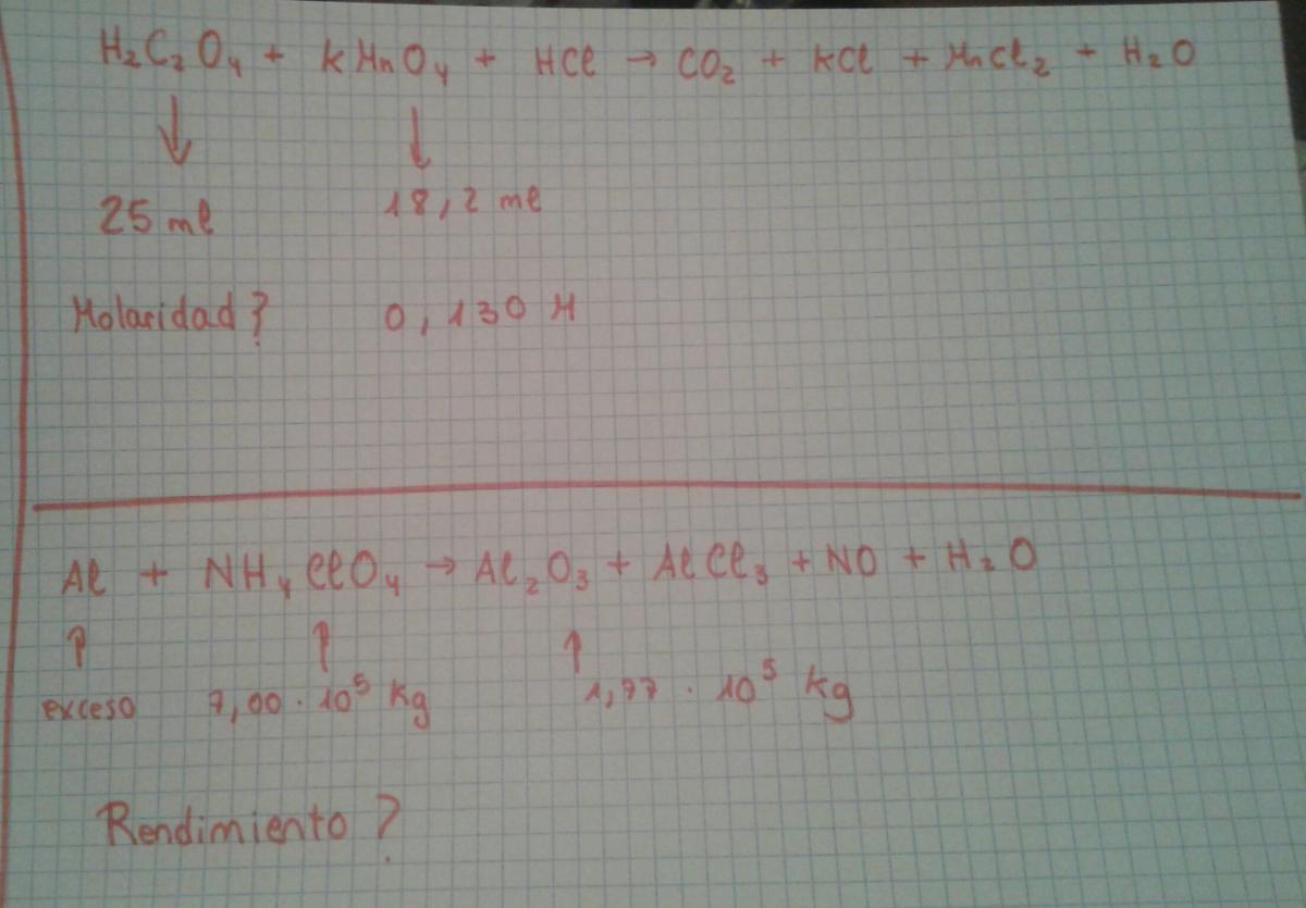Hola Samu, para el primer problema solo tienes que calcular los moles de KMnO4 (permanganato potásico) ya que como la reacción está ajustada, reaccionarán con la misma cantidad de moles de H2C2O4 (ácido oxálico) y con los moles hallados podremos calcular su molaridad (M). Procedemos: KMnO4 0,130M = moles de soluto/0,0182L (que es el volumen de disolución en litros), despejamos los moles= 0,130 x 0,0182 = 0,002366 moles de permanganato. Como hemos dicho que reaccionan con los mismos moles de oxálico, la molaridad de este será M = 0,002366/0,025= 0,095 que podríamos redondear a 0,1M. →