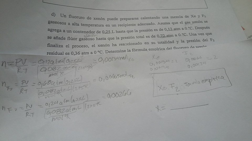 Un fluoruro de xenon puede prepararse calentando una mezcla de Xe y F2 gaseosos a alta temperaturas en un recipiente adecuado. Asuma que el gas xenon se agrega a un contenedor de 0,25 L hasta que la presion es de 0,12 atm a 0°C. Despues se añade fluor gaseos hasta que la presion total es de 0,72 atm a 0°C. Una vez que finaliza el proceso, el xenon ha reaccionado en su totalidad y la presion del F2 residual es 0,16 atm a 0°C. Determine la formula empirica del floururo de Xenon.