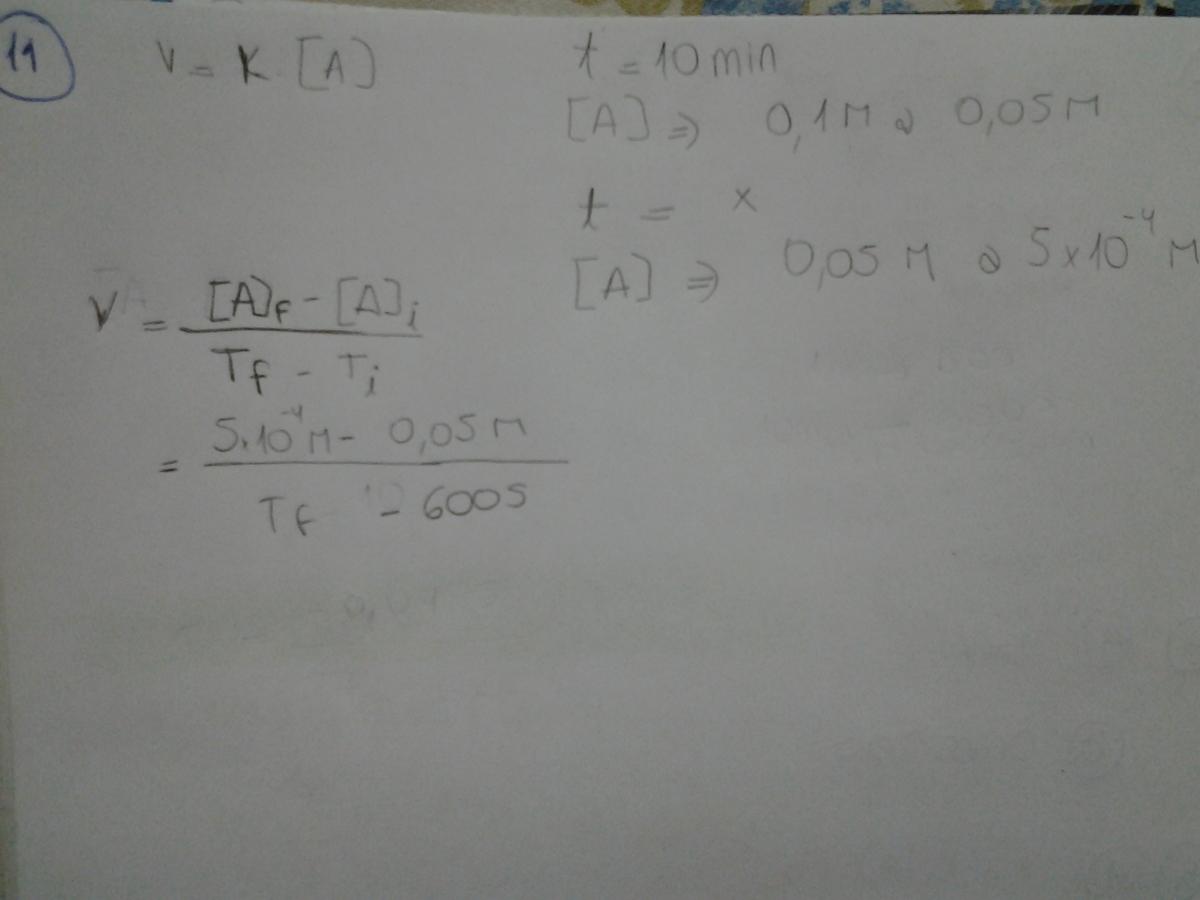 Chicosss !! Hice hasta esta parte del ejercicio peronose si esta bien planteado. El enunciado dice si para la concentracion de primer orden A---> productos se necesitan 10 minutos para que la concentracion del reactivo Apase de 0,1 M a 0,05 M determinar el tiempo necesario para que la concentracion de A se reduzca de 0,05 M a 5 x 10 ^-4 M ![]()