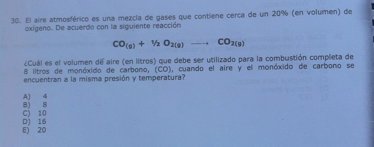 Hola Joship, para el ejercicio 30 solo tienes que calcular los moles equivalentes a 8 litros de CO (g) en condiciones normales, pues el ejercicio no dice lo contrario, de manera que si 1 mol de gas en c.n. equivalen a 22,4L; 8L equivaldrán a x= 0,357moles. Si 1 mol de CO (g) reacciona con 1/2 mol de O2 (g), entonces 0,357 reaccionarán con la mitad de moles de oxígeno, o sea, 0,178 moles. Esos moles traducidos a volumen no es más que hacer el paso inverso al primero que hicimos al empezar el ejercicio, obteniendo 4L de O2. Si nos dicen que un 20% del aire es O2 , qué volumen de aire necesito para que en el haya 4L de oxígeno? Pues dividimos 4/20%, o sea, 4/0,2 = 20L de aire. (Respuesta E)