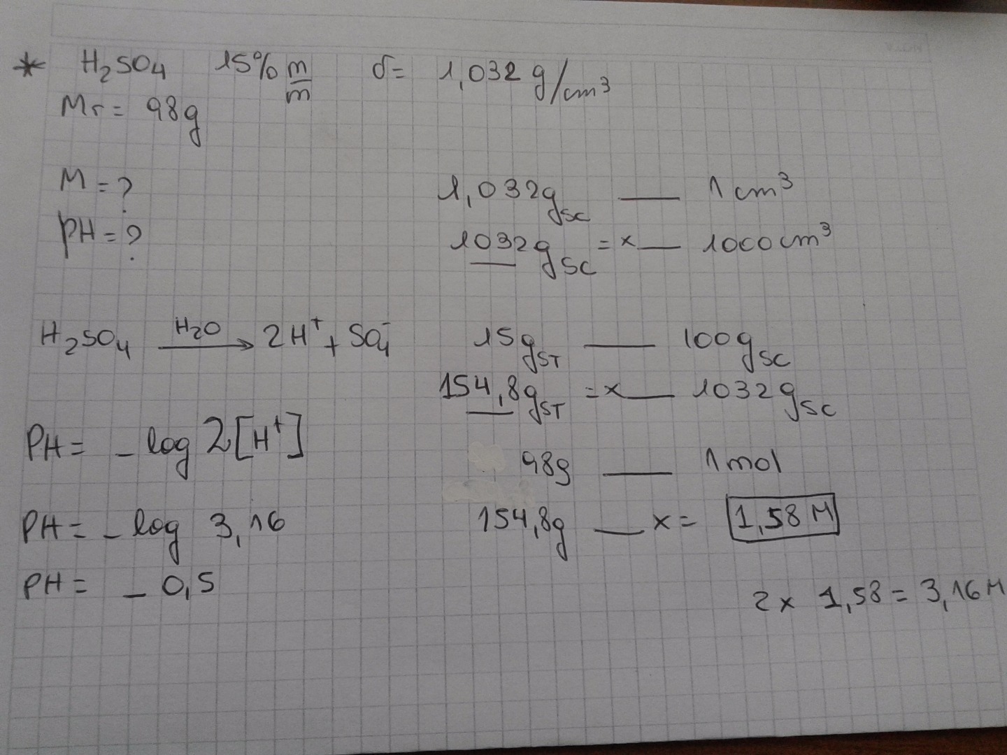 Hola! en el siguiente ejercicio me pide calcular la Molaridad y pH de una solución. Cuando quiero calcular el pH, el resultado me da negativo. Podrán ayudarme para saber en que me estoy equivocando?