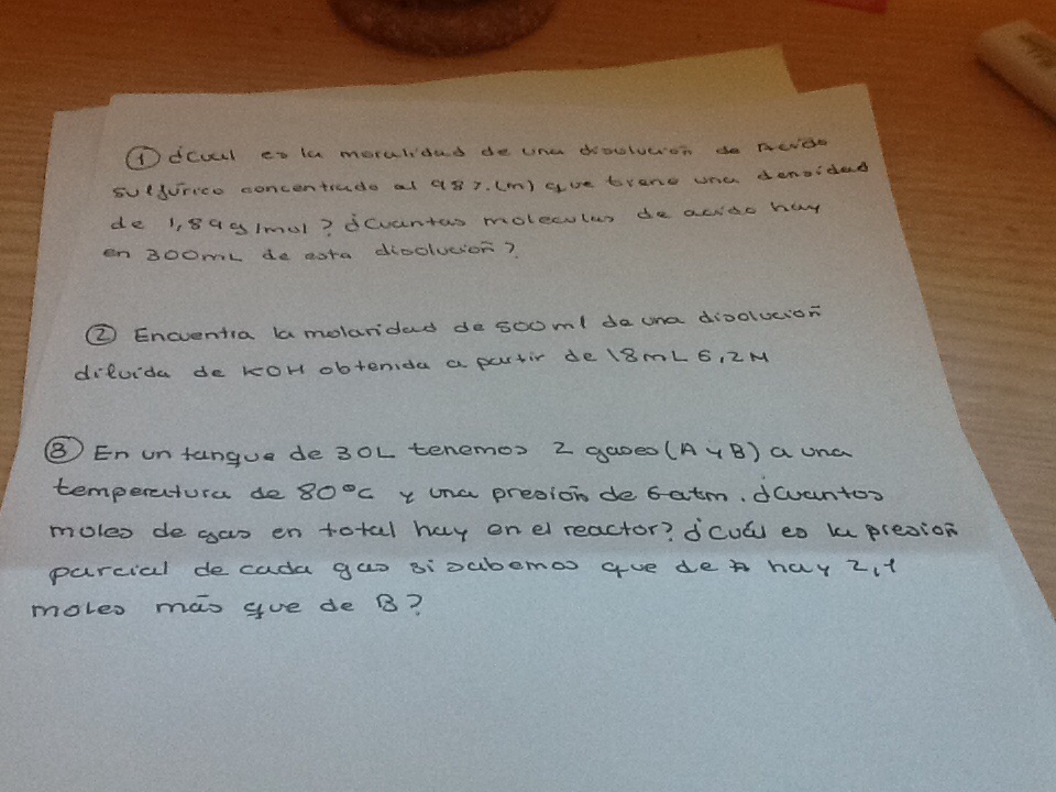 Hola Raquel! Para el primero, lo que hago es tomar teóricamente un litro para conocer la molaridad de la disolución, suponiendo que esta se encuentre en un frasco de dicha cantidad → 1L=1000ml por la densidad que es 1,89g/ml tendremos que esa disolución tiene una masa de 1890gramos; si está al 98% de riqueza significa que realmente tenemos 1852,2 gramos de H2SO4; dividido entre 98g/mol que es el peso molecular nos queda 18,9 moles; la molaridad es igual a moles de soluto dividido entre litros de disolución, y como dijimos que tomábamos un litro teóricamente nos queda una concentración de 18,9M. En el mismo ejercicio nos pregunta cuántas moléculas de ácido hay en 300ml → 300ml por la densidad 1,89=567g; por la pureza 98/100= 555,66gramos que dividido entre el peso molecular 98g/mol nos quedan 5,67 moles (y esto significa moles de moléculas) por lo que multiplicado por en número de Avogadro hallamos que en 300ml tenemos 3,41x10^24 moléculas de H2SO4.