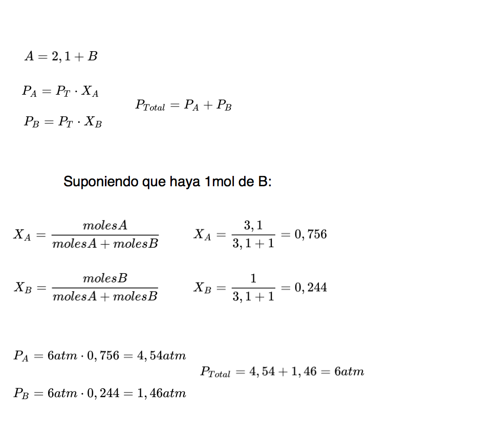 Para el tercer ejercicio usaremos la ecuación general de los gases, PV=nRT, para determinar el número de moles de gas que hay en el reactor → 6atm·30L=n 0,082 · (273+80)K= 0,161 moles en total.