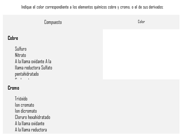NH3 (gas), CrO4 (2-) (color amarillo), MnO4 (2-) (color violeta), Fe(OH)3 (Precipitado pardo)