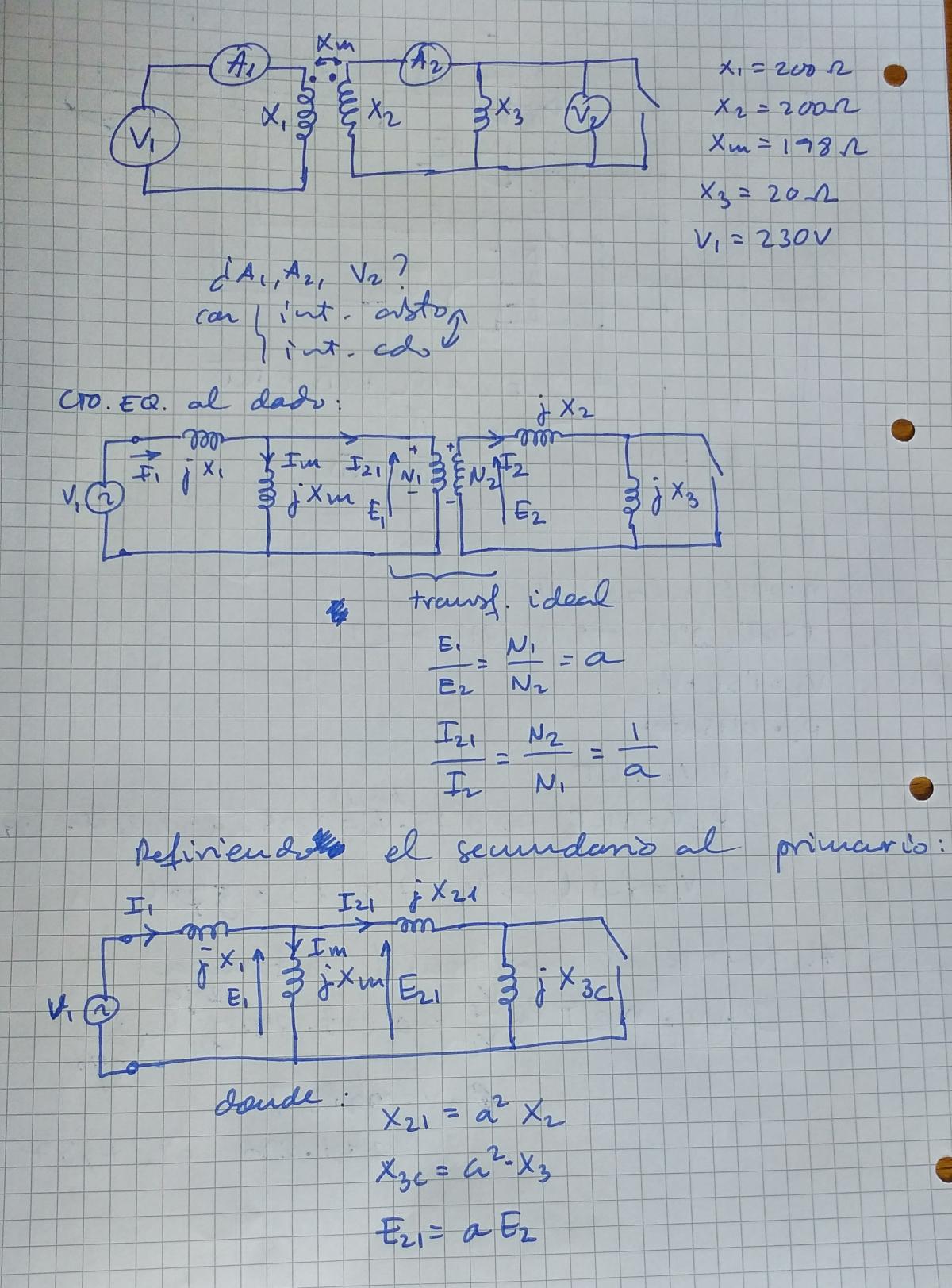 Lo primero que me sorprende del enunciado es que tratandose de un transformador no se nos dé la relación de trasformación (relación de espiras entre primario y secundario). Este dato es fundamental para los cálculos. Le llamaremos “a”