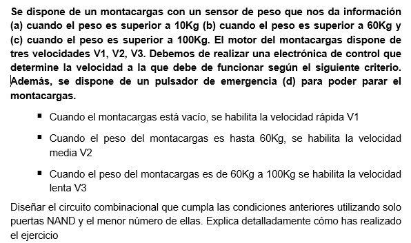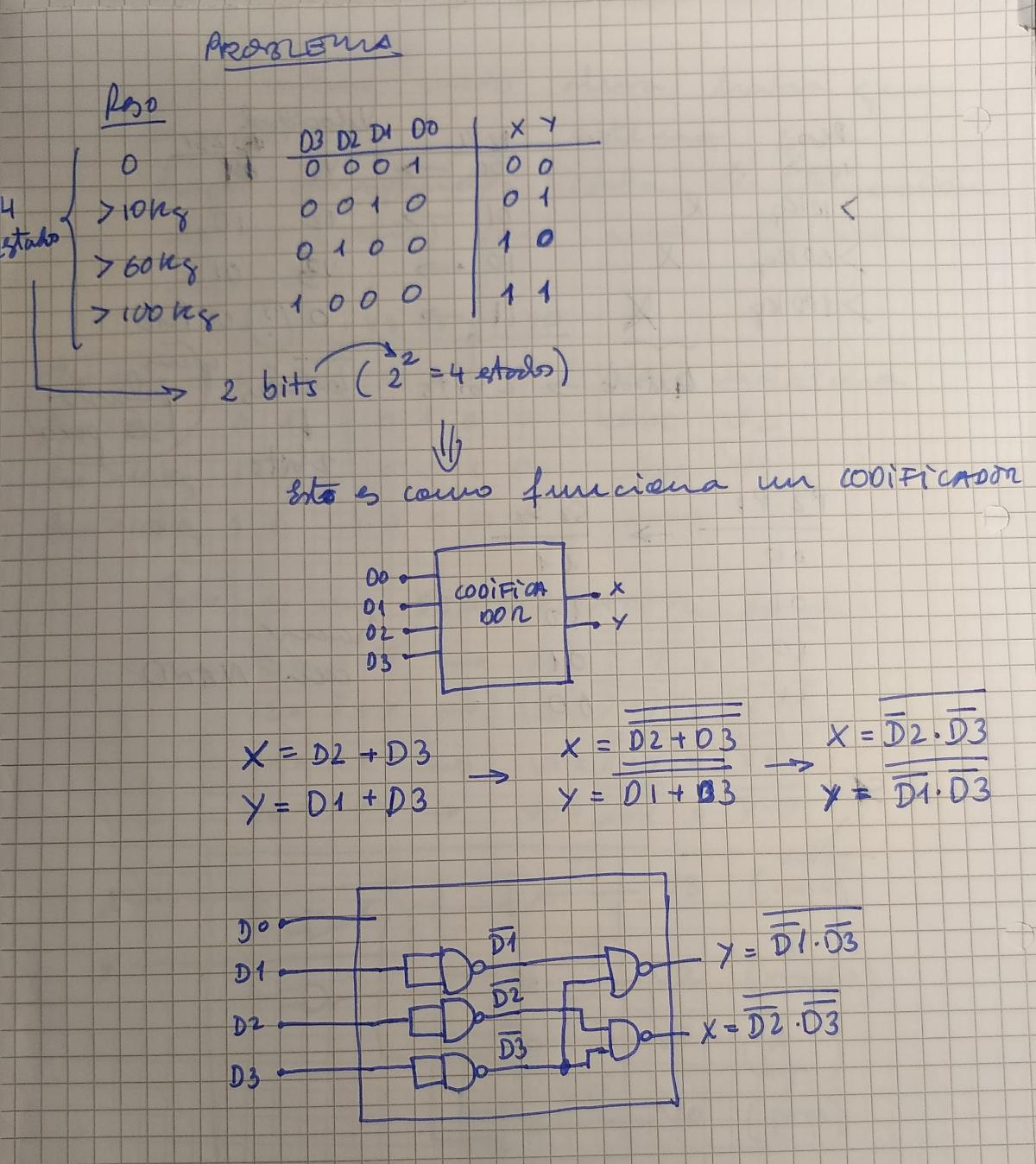 se quiere controlar un elevador con un parametro de peso. Bien entonces nos situamos mentalmente en circuitos de control de sistemas, y ahora bajamos un poco mas en el detalle del enunciado: nos dan 4 posibilidades de peso, vacio, mayor de 10 kg, de 60 kg o de 100 kg. Como son cuatro estados posibles nos harian falta ¿cuantos bits para representarlos? 2 solo por que 2 elevado a 2 (bits) es 4 que es el numero maximo de estados que podria representar con 2 bits.