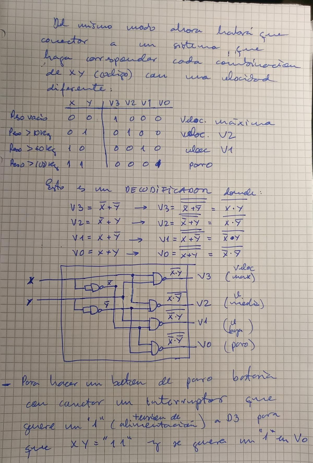 En resumen creamos un codificador para convertir las distintas entradas de peso en cuatro diferentes estados que mediante dos hilos llevamos a un decodificador que los convertira en cuatro distintas salidas que atacaran al sistema que controla la velocidad del elevador.