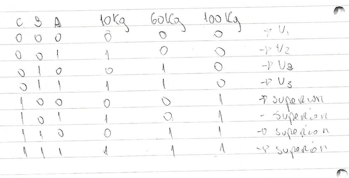 Lo mas habitual es que el detector de peso sea una "caja negra" con cuatro entradas (al menos) y cada una de estas entradas reciba un 1 cuando detecte uno de los pesos indicados ... por facilidad sigo en las imagenes que adjunto